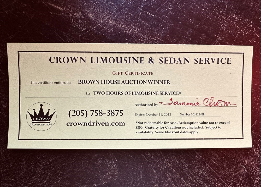 2 hours of limousine service courtesy of Crown Limousine. Driver tip is NOT included.