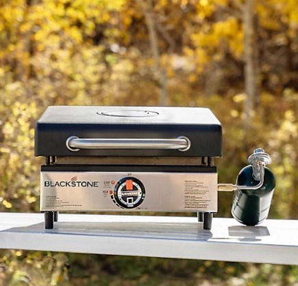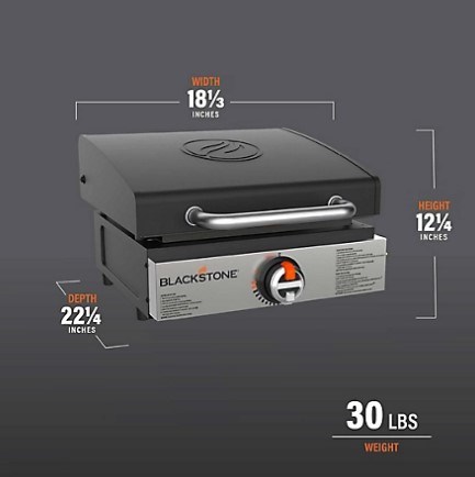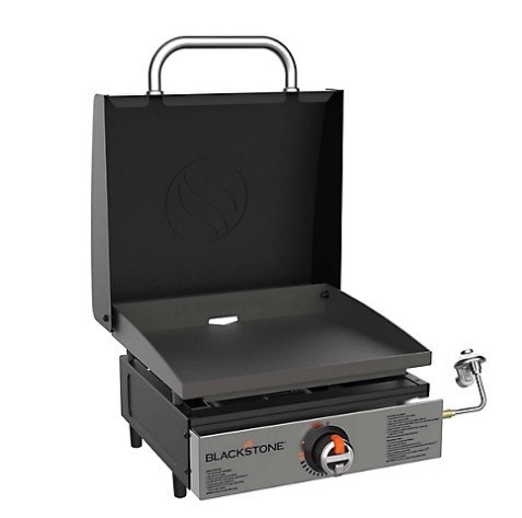 Wherever you may be, the Blackstone Original 17 in. Tabletop Griddle with Hood will accompany you. Quality food on a quality griddle is always available with this travel-sized appliance, complete with cutting edge features like the patented rear grease management system. While the smallest of Blackstone griddles, this machine boasts 267 sq. in. of cooking space with 12,500 BTUs. This beautiful griddle will be the star of any party because anything worth cooking is worth cooking on a Blackstone. This flat grill offers 17 in. cooking space - 267 sq. in. Precise controlled cooking zone with a total of 12,500 BTUs Tabletop griddle features a single stainless steel H-style burner Patented rear grease management system Piezo ignition Griddle is compatible with 1 lb. propane tank or 20 lb. tank with adapter (sold separately)