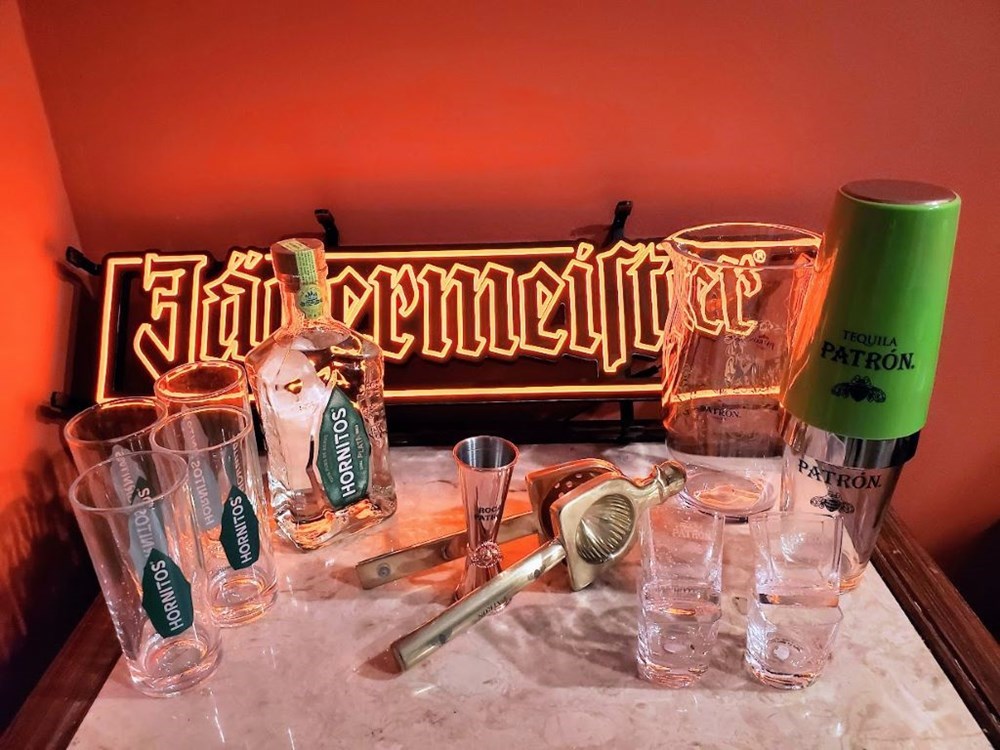 Variation 1: Enhance your home bar with this sleek Bar Set featuring a Jägermeister sign. It includes 4 Hornitos tall glasses, a shot measure, a lemon/lime squeezer, a Patron Shaker, a Patron Pitcher, and 2 shot glasses. Elevate your tequila experience with this premium set. Place your bid now! Variation 2: Upgrade your drinking experience with this all-inclusive Bar Set adorned with a Jägermeister sign. This set features 4 Hornitos tall glasses, a shot measure, a lemon/lime squeezer, a Patron Shaker, a Patron Pitcher, and 2 shot glasses. Take your tequila enjoyment to new heights and place your bid today! Variation 3: Elevate your home bar collection with this exceptional Bar Set boasting a Jägermeister sign. Enjoy the deluxe experience with 4 Hornitos tall glasses, a shot/half shot measure, a lemon/lime squeezer, a Patron Shaker, a Patron Pitcher, and 2 shot glasses. Raise the bar with Hornitos tequila and place your bid for this extraordinary set now!