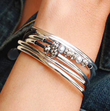 Look chic and accessorize in style! This Charmer Wrap Bracelet gets a double-take with its double leather strand and small freshwater pearls, plus silver plate beads and crescents for a seriously stylish look. With just the right amount of crescents to give it functional and design balance, you’ll have the perfect wrap bracelet for all your free-spirited looks! (Charms sold separately.) The Charmer silver & leather wrap bracelet and necklace is perfect for anyone who loves adding charms! double leather strand 2 small freshwater pearls silver plate beads, crescents and clasp three crescents on one strand, four on the other achieves functional & design balance