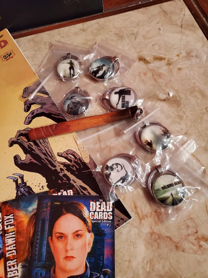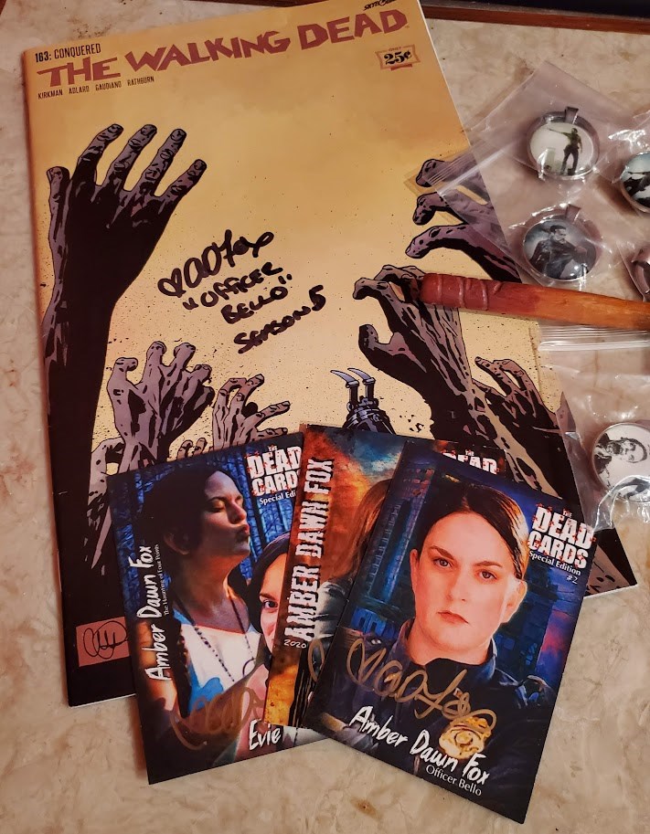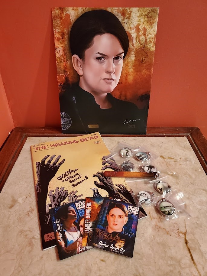 These items were donated by the lovely Amber Dawn Fox! Autographed "The Walking Dead" comic, 3 signed Dead Cards, 7 unique key chains and an autographed Sooki Martinsen photo!