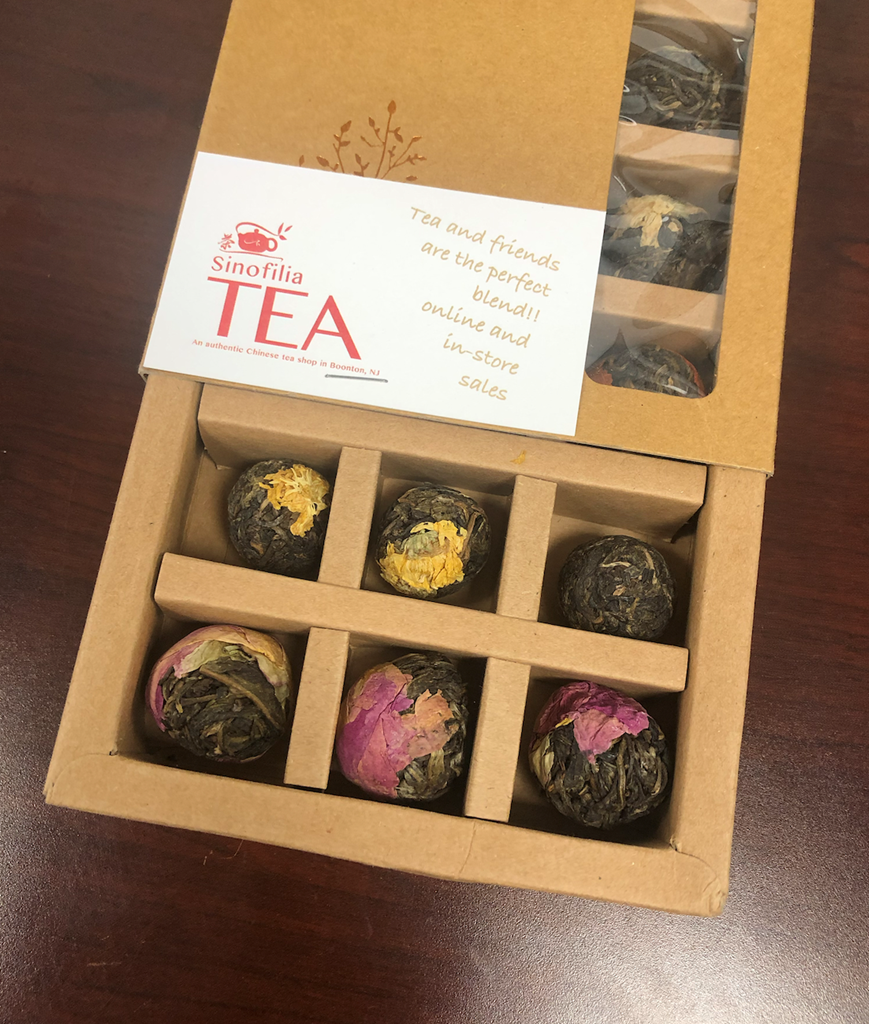 The tea is Raw Puerh + different flowers: rose, white and yellow Chrisanta flowers, lael, flower, penny flower, jasmine flower. Each tea balls can make multiple infusions.